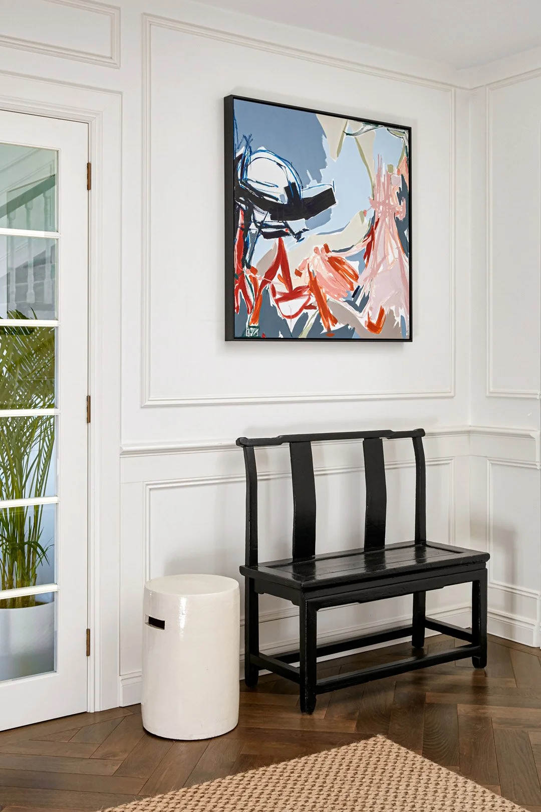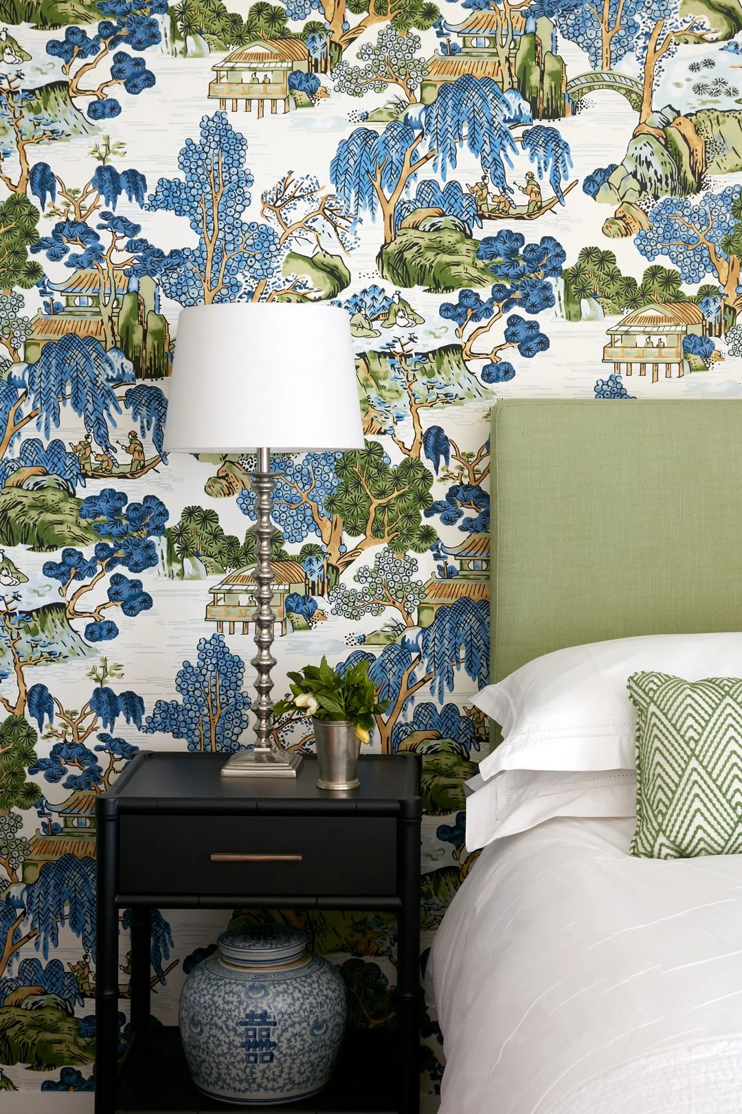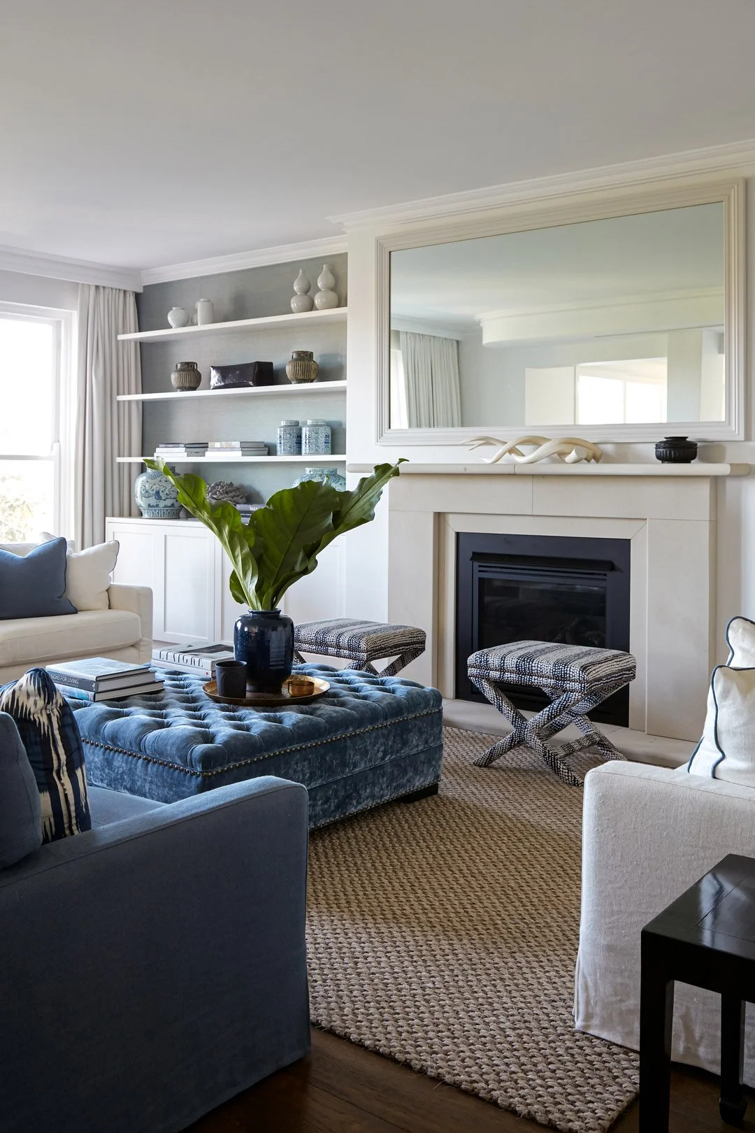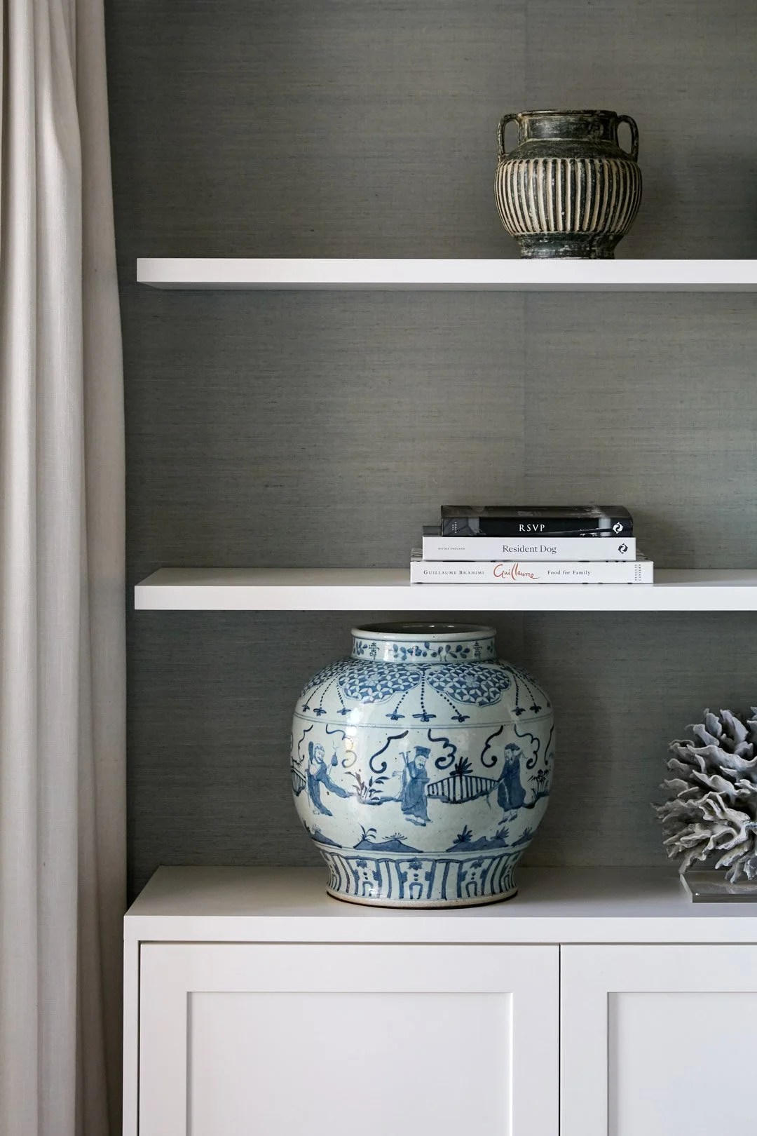 Schumacher sea grass cloth was inserted in custom joinery in the formal living to create a showcase for the clients objet. We also understood the client had sentimental family heirloom furniture that we reupholstered creating layers of history alongside bespoke custom furniture.